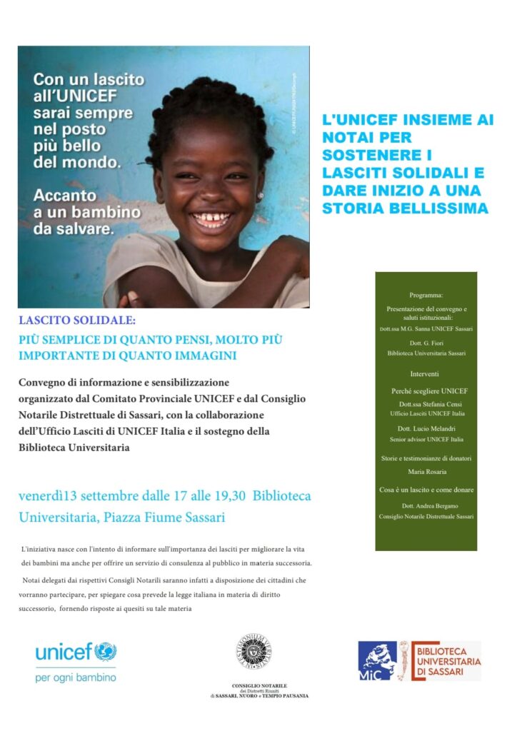L’iniziativa รจ organizzata, con il sostegno della nostra Biblioteca Universitaria di Sassari , dal Comitato Provinciale UNICEF e dal Consiglio Notarile Distrettuale di Sassari, con la collaborazione dell’Ufficio Lasciti di UNICEF Italia .